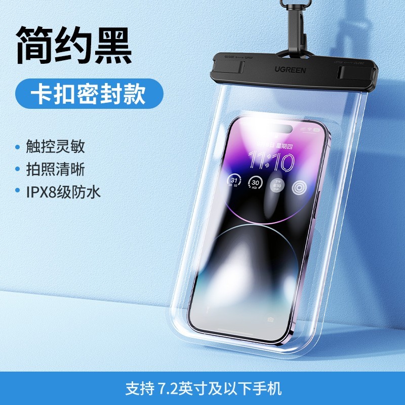 绿联手机防水袋是一款专为户外运动爱好者设计的实用配件,采用高透明材质打造,拥有良好的密封性和防水性能,适用于游泳、海边游玩、潜水、漂流等多种场景,有效保护手机不受水汽侵扰,同时支持触屏操作,方便随时拍照或使用手机功能。这款自封密封袋设计合理,开合方便,适配多种手机尺寸,是水上活动中不可或缺的好帮手。