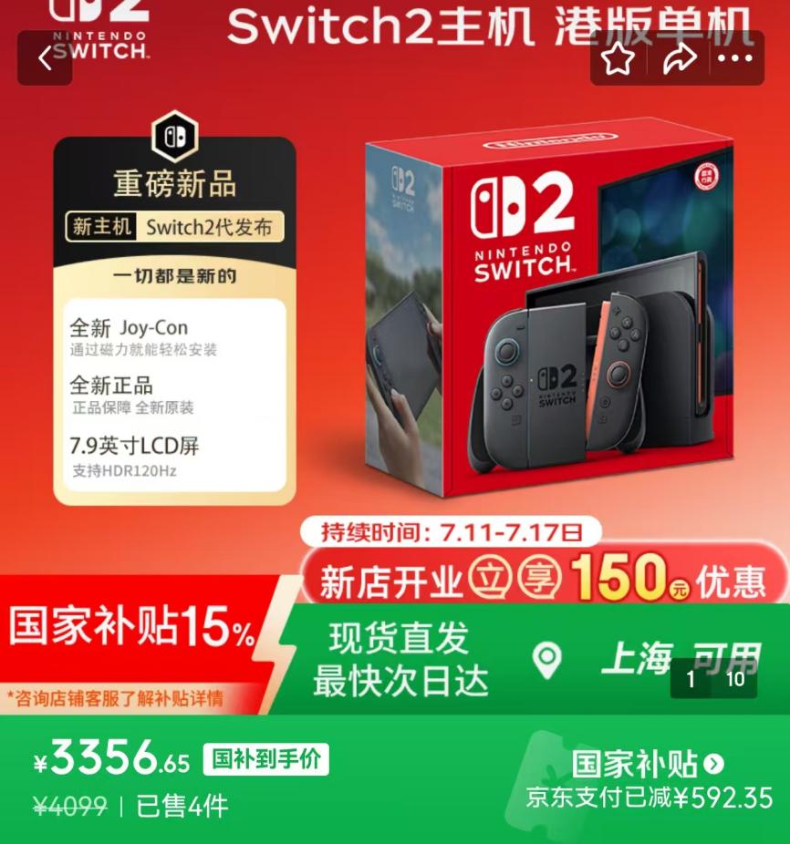 目前,热度火爆的Switch 2游戏机港版单机正在NINTENDO SWITCH 2京东自营旗舰店火热销售中,售价4099元,叠加新店开业150元优惠及国补15%优惠后,到手价低至3356.65元,此外更快的发货速度也将让众多用户第一时间体验到官方正品Switch 2,在全新的设计巧思下获得全新的Switch游戏体验。