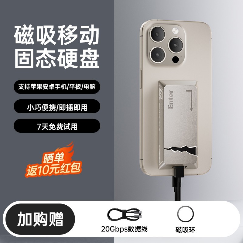 移速 movespeed磁吸移动固态硬盘专为iPhone15及苹果16系列手机打造,兼具高速传输与便捷使用的特性,是自媒体创作者和旅行达人的理想伴侣,该硬盘采用磁吸设计,轻松吸附稳定可靠,支持高达2060MB/S的读写速度,助力高效办公与创意工作,现天猫商城正在火热促销中,这款原价499元的优质产品,在使用满300减100优惠券后,最终到手价仅需399元,性价比极高,容量达512GB,满足你外出时的大容量存储需求,有需要的朋友千万不要错过!