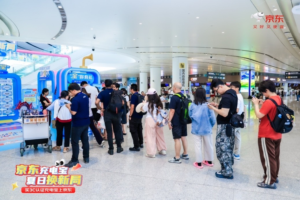 7月22日,“京东充电宝夏日换新局”活动在北京大兴国际机场出发大厅正式开启。活动现场蓝色主题展台和趣味活动格外醒目,吸引众多旅客驻足围观。工作人员一边向过往行人介绍活动规则,一边引导大家参与互动。不少旅客或手持闲置充电宝,或展示手机中的京东订单,排队兑换全新充电宝,现场气氛热烈而有序。