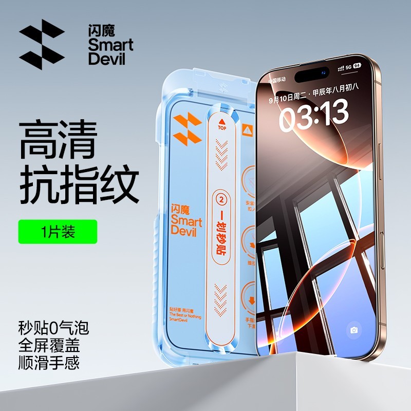 闪魔的这款钢化膜适用于iPhone 16。它是,具有无尘秒贴的特点,而且是1片体验装。颜色分类明确,能够满足不同需求。这款钢化膜对于iPhone 16来说是非常实用的手机配件,它能够全屏覆盖手机屏幕,起到很好的防指纹和防爆保护作用,就像给手机穿上了一层坚固又隐形的保护衣。