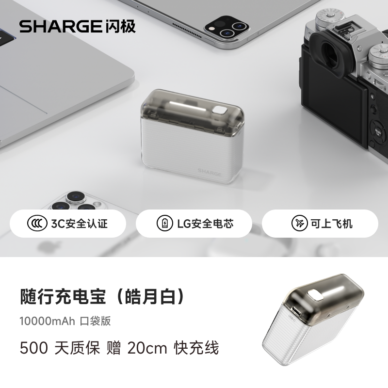 闪极SHARGE随行Mini移动电源10000mAhPD20W是一款兼具高性能与便携设计的充电设备,内置LG-21700安全电芯,容量高达10000mAh,支持PD双向快充技术,最高输出功率可达20W,广泛兼容苹果、华为、小米等多品牌手机、平板及笔记本设备。其采用PC+ABS材质打造机身,提供皓月白、冰蓝色、仙踪绿、水晶紫等多种时尚配色,体积小巧仅如卡片,轻盈便携,适合日常通勤与出行使用。