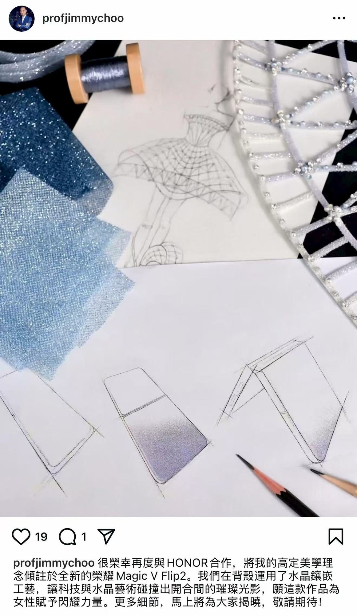 【ZOL中关村在线原创新闻】8月11日,全球知名鞋履设计师、JimmyChoo品牌创始人——周仰杰(Prof.Jimmy Choo)在Instagram上发布了荣耀MagicV Flip2的设计手稿。这是他与荣耀的第二次跨界合作,也是荣耀在小折叠品类上,将“高定时尚”与“尖端科技”深度融合的又一次全新尝试。