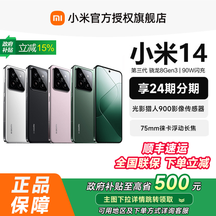 小米 Xiaomi 14 5G手机 正在天猫商城火热促销中,原价2804.15元,现在使用国家补贴享8.5折优惠,立减419.85元,最终到手价仅需2379.15元,性价比极高,喜欢的朋友千万不要错过!小米14延续了小米13系列的经典设计,提供黑色、白色、岩石青、雪山粉四款时尚配色,其中雪山粉版本采用科技纳米皮后盖,手感轻盈舒适,玻璃版厚8.29mm,重193g,纳米皮版更轻更薄,仅8.28mm厚,重188g。手机搭载了一块由小米与TCL华星联合研发的6.36英寸OLED直屏,采用C8发光材料,具备1.5K分辨率、460PPI像素密度,支持1-120Hz自适应刷新率,峰值亮度高达3000尼特,并支持DC调光、P3广色域、莱茵认证、环境色温感应、超动态显示和AI自动亮度等多项护眼与显示技术。性能方面,首发搭载高通骁龙8 Gen 3处理器,采用全新1+5+2架构,CPU性能提升32%,功耗降低34%,GPU性能提升34%,功耗降低38%,强劲性能带来流畅体验。内置4610mAh硅碳负极电池,配备澎湃G1电池管理芯片,支持90W有线快充和50W无线快充,同时搭载澎湃P2快充芯片,升级版USB 3.2 Gen1接口传输更高效。影像系统方面,小米14搭载新一代徕卡Summilux镜头,主摄为f/1.6大光圈,配备7P非球面高透镜片,采用光影猎人900高动态影像传感器,传感器尺寸达1/1.31英寸,支持OIS光学防抖;另外还配备50MP徕卡超广角和50MP徕卡浮动长焦,前置32MP镜头,轻松应对各种拍摄场景。手机还支持IP68防水防尘、NFC、Wi-Fi 7、红外遥控、立体声双扬声器、4麦克风阵列以及X轴线性马达,带来全方位的高端使用体验,现在入手正是最佳时机!
