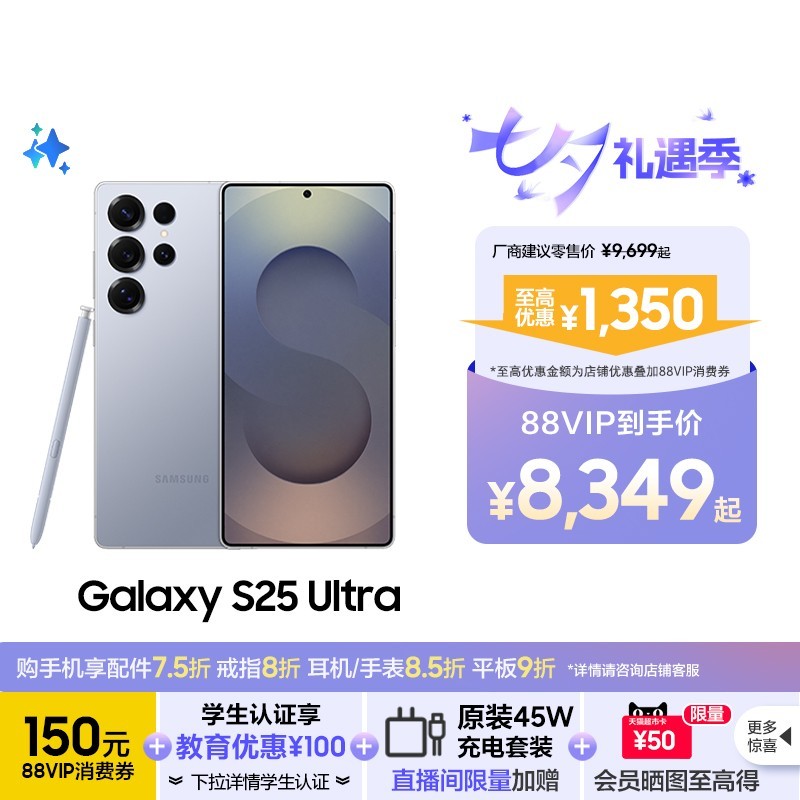 三星 Galaxy S25 Ultra 5G手机 骁龙8至尊版现正在天猫商城促销,原价10699元,参与满9500减1200活动后,最终到手价仅需8499元,性价比大幅提升。这款旗舰手机搭载了专为Galaxy系列优化的骁龙8至尊版移动平台,采用3nm工艺制程,CPU、GPU和NPU性能分别提升37%、30%和40%,运行更加流畅高效。屏幕方面配备6.9英寸第二代动态AMOLED屏,支持1-120Hz自适应刷新率,峰值亮度高达2600尼特,视觉体验清晰细腻。影像系统表现出色,后置2亿像素主摄、5000万像素长焦及超广角镜头,支持3倍和5倍光学变焦以及最高100倍数码变焦,前置1200万像素摄像头满足多样拍摄需求。内置5000mAh大电池,支持无线电量分享,续航持久无忧。同时配备钛金属边框与Corning Gorilla Glass Victus 2玻璃,支持IP68防尘防水,兼具美观与耐用性。系统搭载One UI 7,带来实时窗、灵动动画等全新体验,支持个性化布局与小组件设置。此外还配有超拟人AI助理,具备多模态理解能力,支持跨应用执行链,轻松完成复杂任务,无论是日常使用还是办公场景都能高效应对。功能强大体验出色,现在入手正当时。