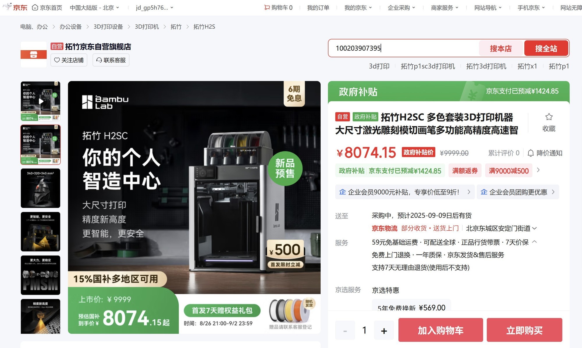 此外,拓竹另一款P1SC 3D打印机目前也在京东热卖中,用户领券下单立减1200元,叠加政府补贴可再省10%,到手价3239.1元,同样可享买贵双倍赔保险。想要尝鲜体验拓竹最新打印机,拥有属于自己的个人智造中心,赶紧锁定京东下