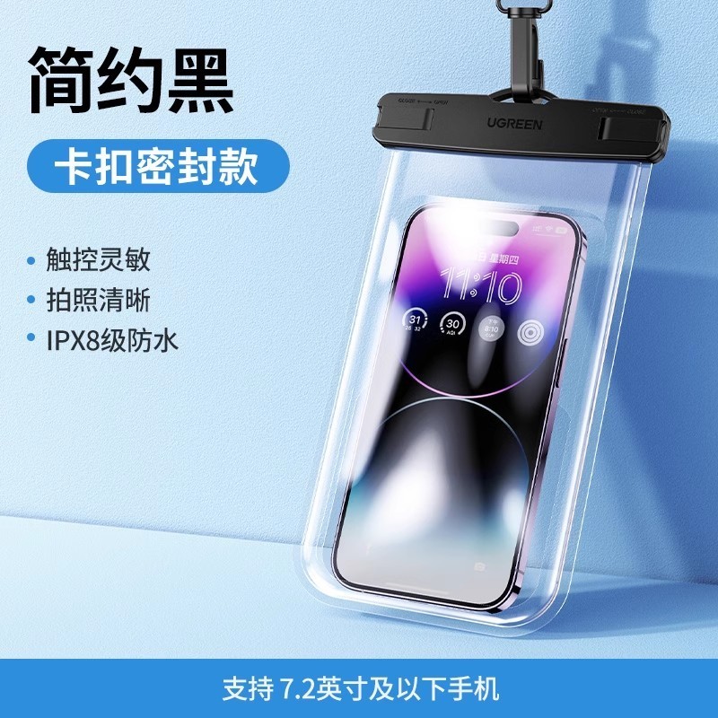绿联手机防水袋是一款专为户外爱好者设计的实用配件,支持7.2英寸以内各类手机使用,适用于游泳、冲浪、洗澡等多种潮湿场景。该防水袋采用IPX8级防水性能,有效隔离水渍侵入,保障手机安全,同时具备高清透明设计,触控灵敏,不影响拍照和操作。颜色为简约黑卡扣密封款,外观简洁大方,密封性能更出色。