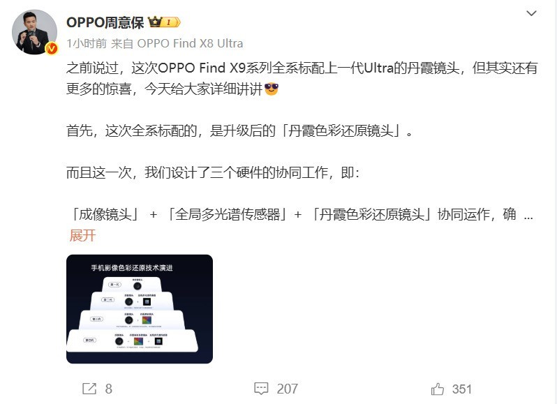 OPPO副总裁周意保今日于社交平台提前分享了OPPO Find X9系列的影像技术亮点,此次Find X9系列不仅全系标配了“升级后的丹霞色彩还原镜头”,还通过「成像镜头」+「全局多光谱传感器」+「丹霞色彩还原镜头」的协同工作,为用户带来更加真实、自然的拍摄体验。
