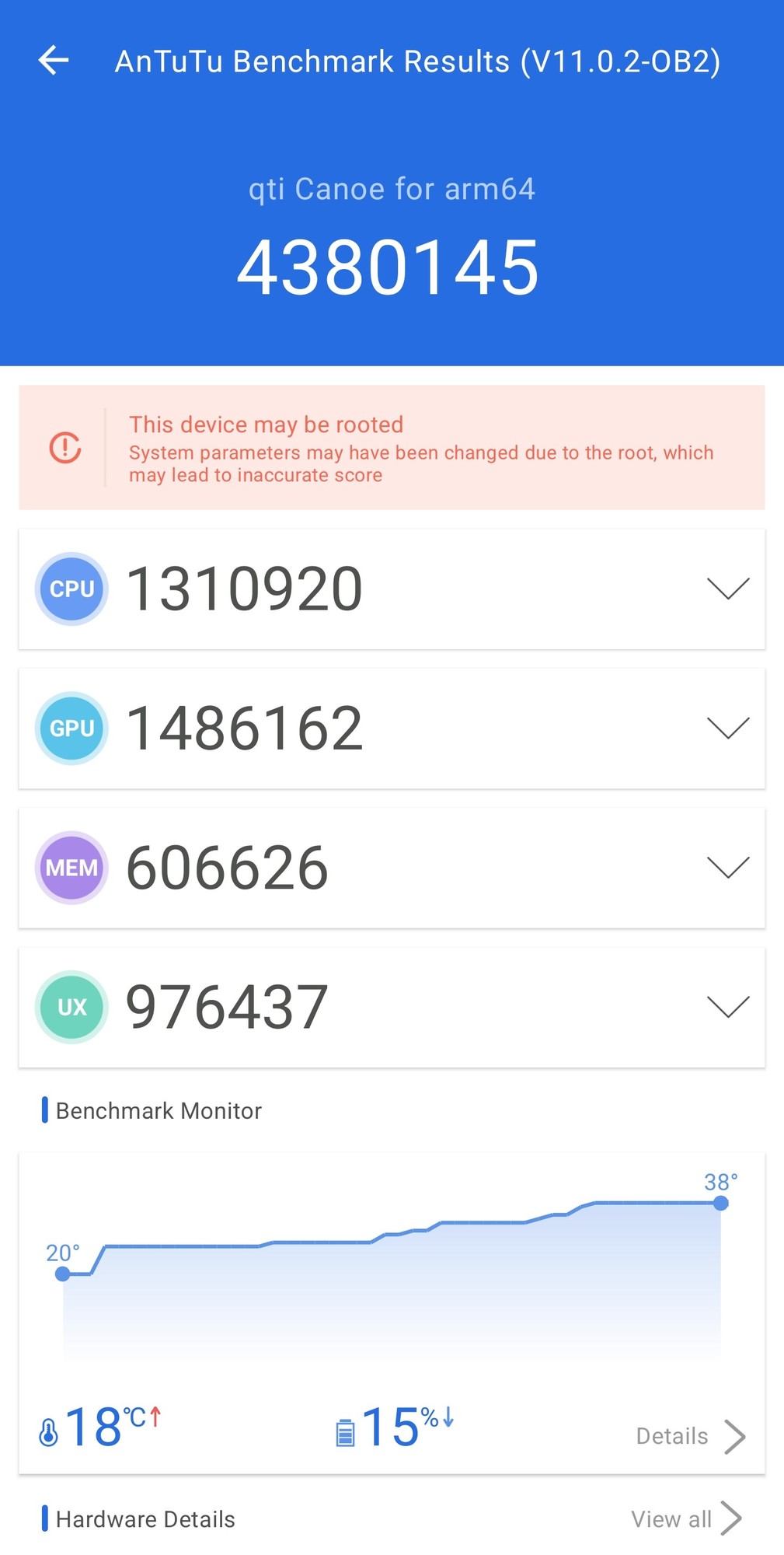 首先是大家比较熟悉的安兔兔,版本是V11 (OB2),在此项测试中,QRD得分超过了438分,其中CPU得分超过131万分,GPU得分超过148万分,综合性能较上一代有明显提升。