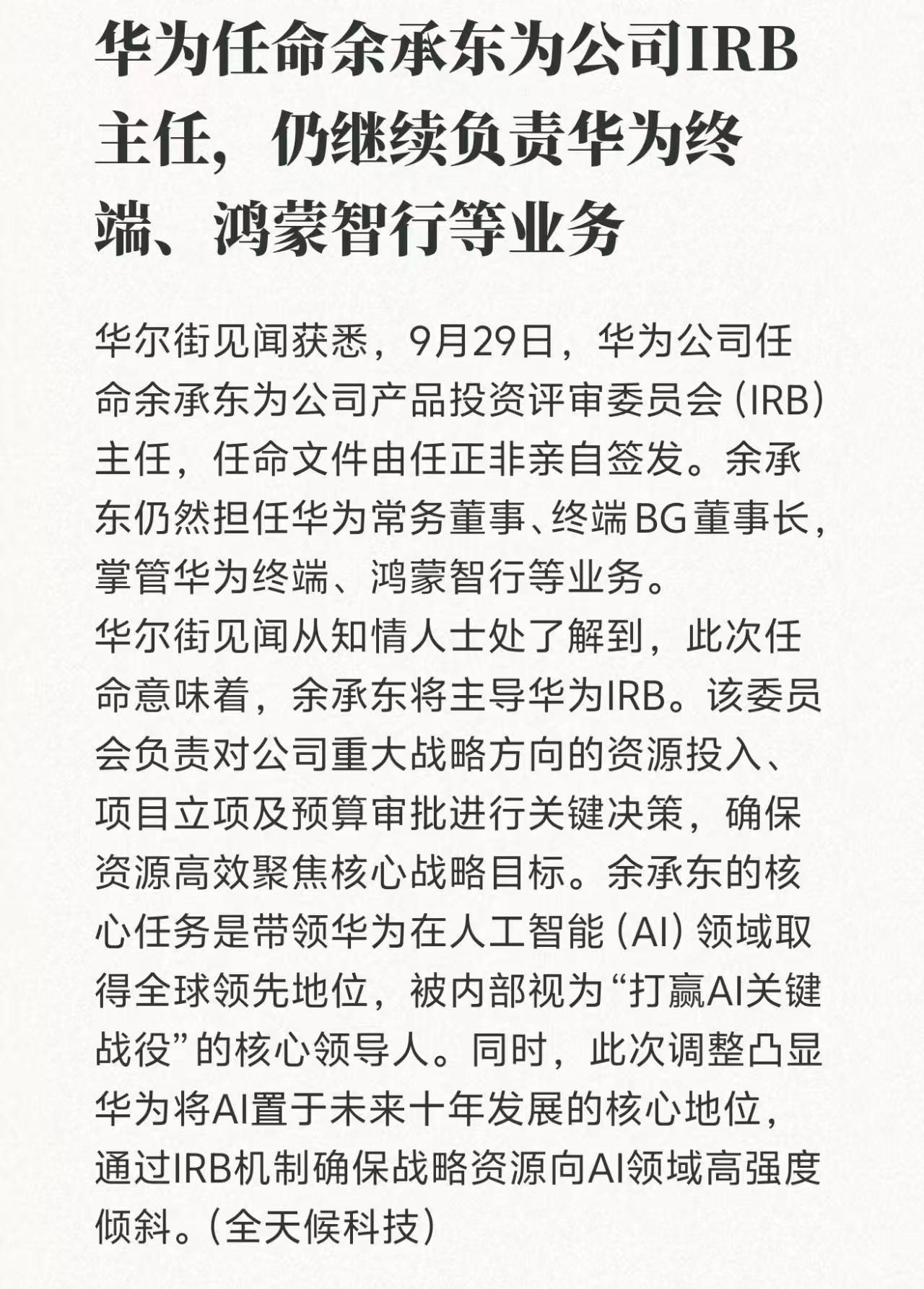 【ZOL中关村在线原创新闻】据华尔街见闻消息,9月29日,华为公司任命余承东为公司产品投资评审委员会(IRB)主任,任命文件由任正非亲自签发。