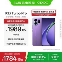 OPPO K13 Turbo Pro 5G手机16GB+256GB初号紫限时特惠来袭,强劲性能与潮流设计兼具,搭载高速5G网络支持,16GB大运存带来流畅多任务体验,256GB超大存储空间轻松容纳海量应用与文件,独特初号紫色外观彰显个性魅力,屏幕显示细腻顺滑,影像系统清晰出众,满足日常拍摄与视频需求,现京东活动售价2199元,参与15%起减优惠立省329.85元,下单1件实付低至1869.15元,真正享受高配低价的购机体验,机会难得,数量有限,抢完即止,赶快行动吧