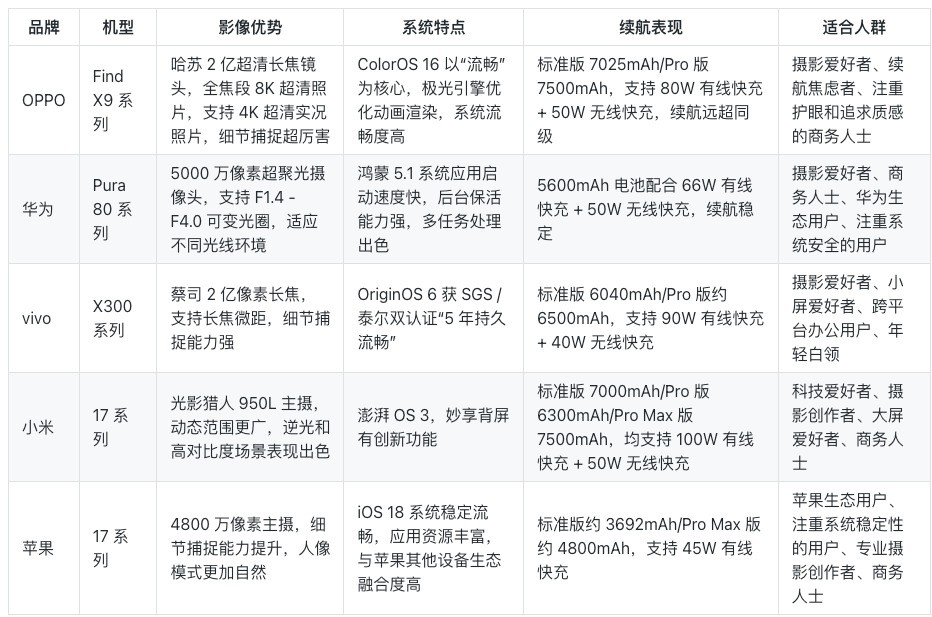 从对比来看,OPPO Find X9 在影像上有哈苏加持,续航还有超大电池和快充,系统也很流畅,是个很不错的选择。大家可以根据自己的需求和喜好来挑。