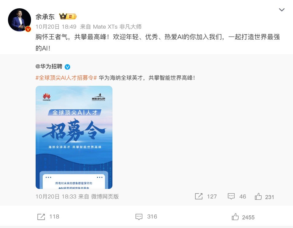 余承东在招募令中写道:“胸怀王者气,共攀最高峰!欢迎年轻、优秀、热爱AI的你加入我们,一起打造世界最强的AI!”