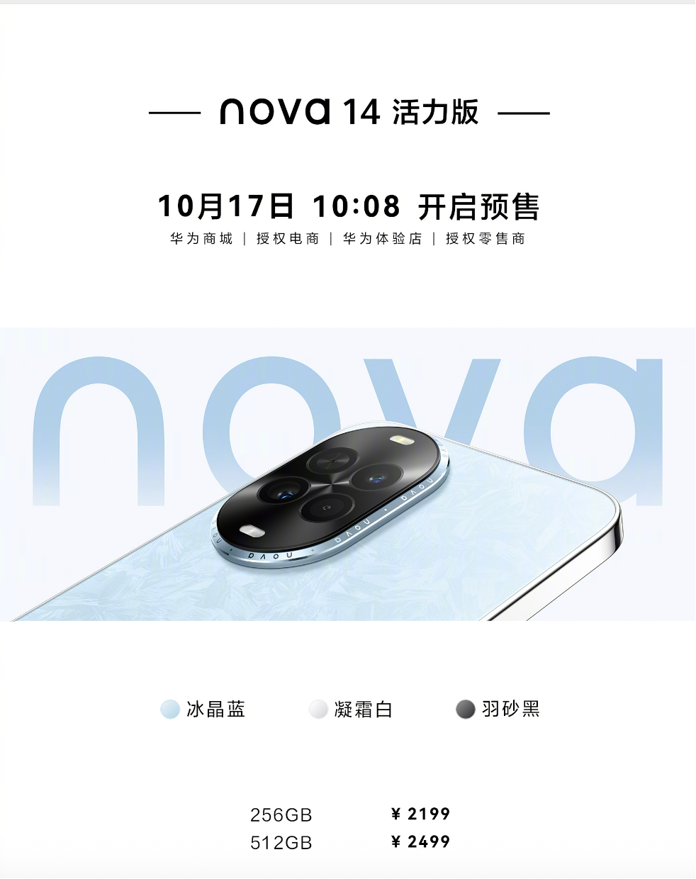 10月17日上午10:08,华为nova系列新品——nova 14 活力版正式在华为商城、华为授权电商同步开启预售,预售价格2199元起,并将于10月24日正式开售。凭借在设计、影像、系统、续航等方面的出色表现,为追求个性与实用的年轻用户带来新选择。