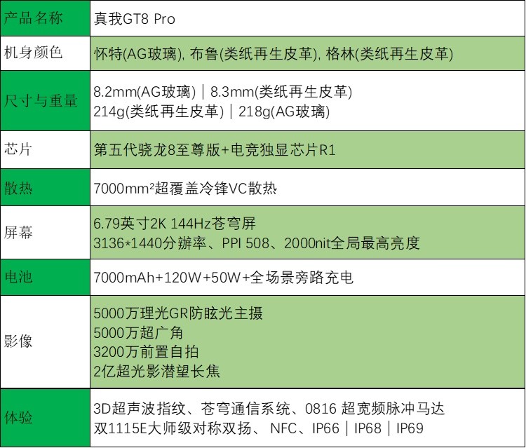 真我GT8 Pro还拥有“布鲁”、“格林”两款配色,均采用类纸再生皮革打造,纸浆皮革从原料到表层均采用环保材料打造而成,机身雕琢有光子纳米雕刻工艺打造的立体字体,整机还通过全球回收标准认证,展现出真我对于环保的态度。