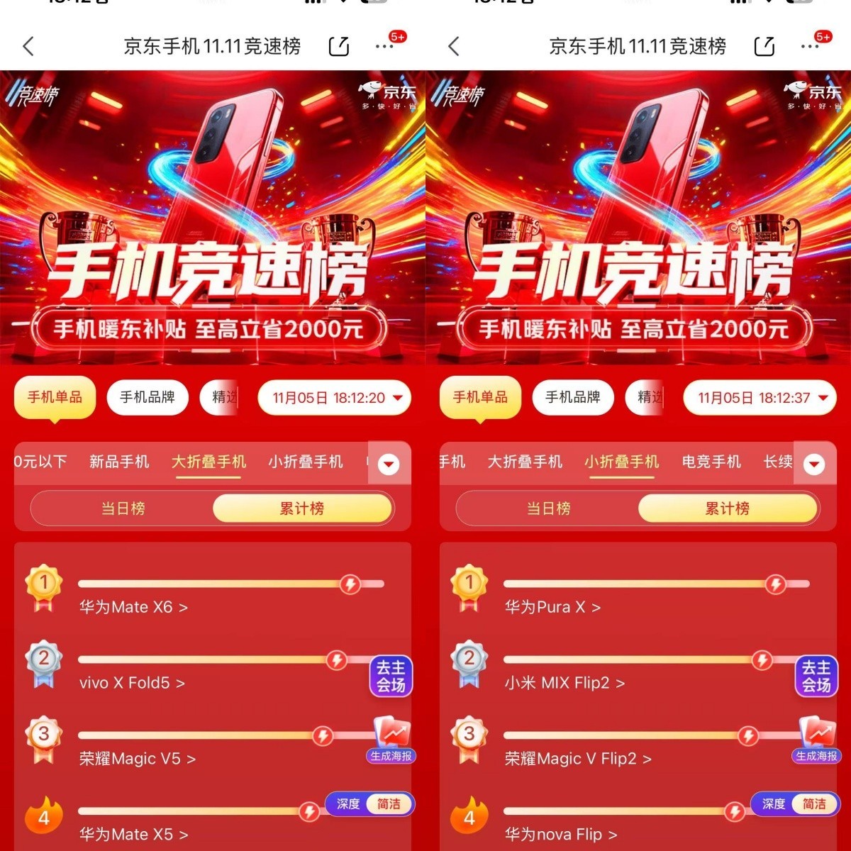 随着双十一大促进入冲刺阶段,折叠屏手机市场也迎来年度消费高峰,那么双十一买什么折叠屏好?根据“京东手机11.11竞速榜”数据显示,华为折叠屏家族在双十一期间销量全面爆发,成为折叠屏市场的领跑者——无论大折叠品类还是小折叠品类,华为折叠屏家族产品均成为行业销冠。
