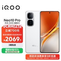 iQOO Neo10 Pro 5G智能手机全新发布于2024年11月29日搭载天玑9400处理器由iQOO MTK ARM三方联合调校安兔兔综合跑分突破320万分刷新安卓阵营新纪录性能强劲无可匹敌配合UFS4.1与9600Mbps LPDDR5X Ultra存储组合确保系统运行丝滑流畅游戏应用多任务切换毫无压力机身设计延续悬浮之窗理念薄至7.99mm轻至199g握感舒适手感出众提供驰光白疾影黑拉力橙三种时尚配色其中驰光白配色尽显优雅格调正面配备6.78英寸1.5K+144Hz 8T LTPO F1直屏支持2592Hz全亮度高频调光带来极致视觉享受并具备新一代超感触控多指触控优化及湿手触控功能日常使用和游戏操控更加得心应手影像系统采用索尼IMX921传感器5000万像素大底主摄支持OIS超级光学防抖与VCS人眼仿生技术配合CPA 4.5专业级防抖算法和蓝厂旗舰同款NICE夜景算法成像清晰色彩还原真实低光照环境下依然表现出色搭配800万像素超广角镜头拍摄视野更广阔安全与交互体验同样出色支持3D超声波指纹识别解锁更快更安全内置定制高振感X轴马达支持NFC双频GPS北斗精准定位以及Wi-Fi7网络连接功能全面提升使用便捷性现该机12GB+256GB驰光白版本限时特惠原价2299元叠加10%起减229.9元优惠后到手价仅2069.1元性价比极高感兴趣的朋友不容错过