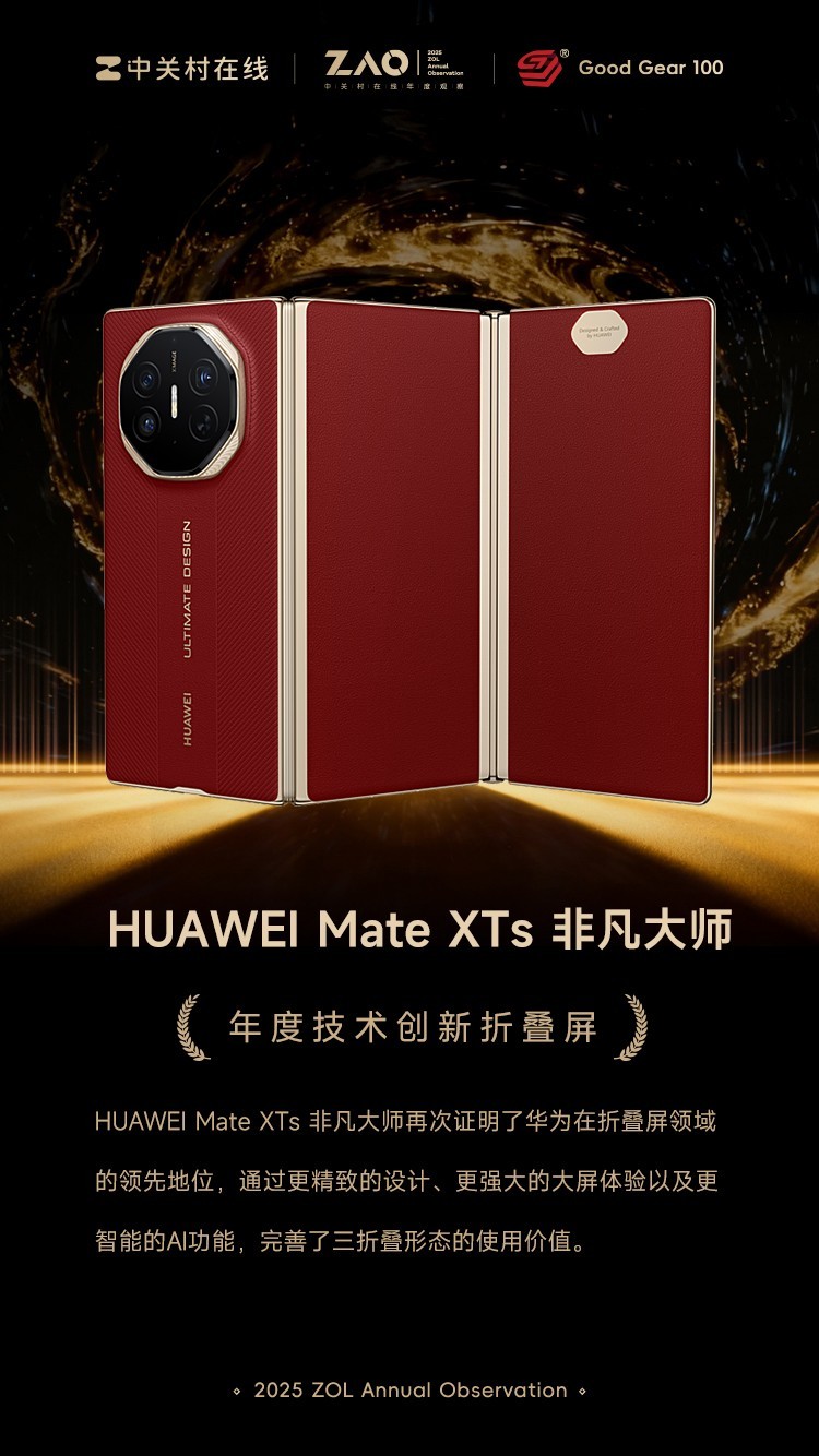 本文属于原创文章,如若转载,请注明来源:GG100 2025年度技术创新折叠屏:HUAWEI Mate XTs 非凡大师https://mobile.zol.com.cn/1096/10964459.html