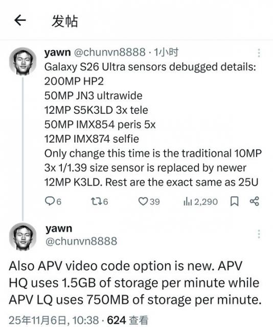 据海外爆料达人最新发布的信息显示,与此前曝光的消息基本一致,全新的三星Galaxy S26 Ultra将配备2亿像素主摄、5000万像素超广角镜头、1200万像素长焦镜头和5000万像素潜望长焦镜头,前置1200万像素自拍镜头。同时该博主透露,与上一代S25 Ultra相比,新机的影像配置的主要变化在于将长焦镜头从1000万像素升级到了1200万像素,可能会带来更出色的细节表现和成像质量。不仅如此,该机还将在视频编解码方面还引入了全新的APV选项,在视频拍摄画质方面将有大幅的提升,可为用户提供更多元化的视频拍摄选择。