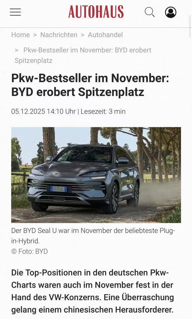 近日,BYDSEALU(宋PLUS)成为德国11月车市插混车型销量冠军,欧洲市场格局正被重塑,引发行业广泛关注。这不仅是中国汽车品牌首次在德国主流细分市场登顶,更意味着比亚迪在欧洲的规模化突破已进入全新阶段。