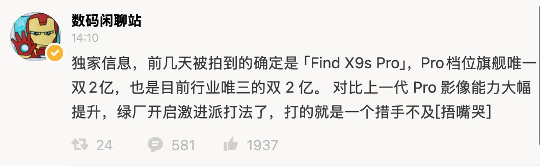 【ZOL中关村在线原创新闻】近日,知名数码博主 @数码闲聊站 透露,此前曝光的 OPPO 测试机型身份确认为 Find X9s Pro。据悉,该机型在影像系统上进行了显著升级,配备了行业内少见的双 2 亿像素摄像头组合,预计将带来比前代产品更强的拍摄体验。