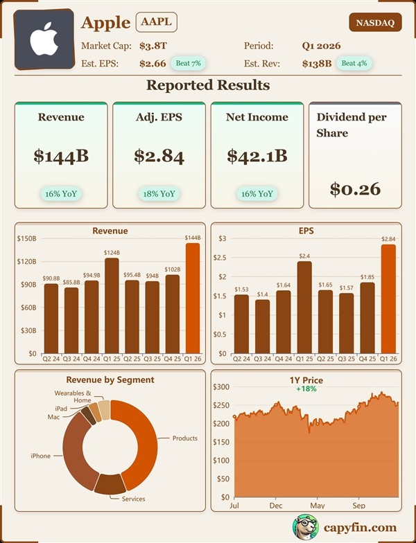 苹果公司近日发布2026财年第一季度财报,该季度对应2025日历年第四季度。数据显示,公司实现营收1438亿美元,同比增长16%;净利润达421亿美元,每股收益2.84美元,同比增长19%,各项核心财务指标均高于市场普遍预期。