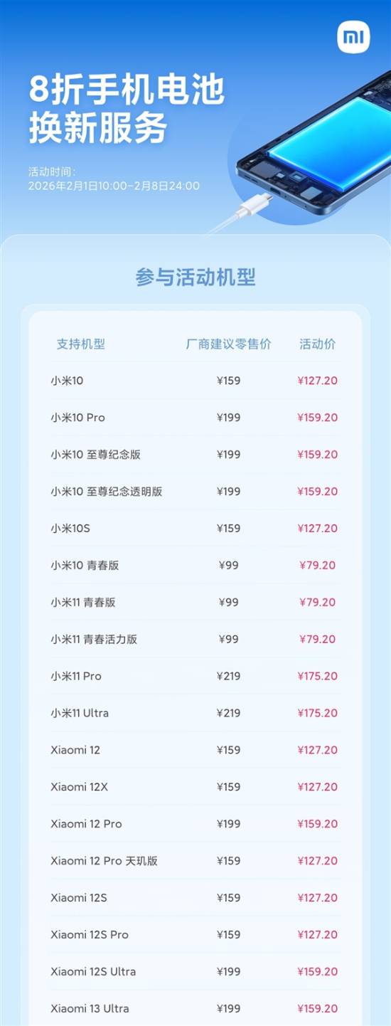 本次八折电池更换服务覆盖七十余款机型,最低售价七十九点二元起。所涉机型既包括小米10系列、小米11 Pro、小米MIX Fold等曾引领行业风潮的老款旗舰,也涵盖REDMI 10A、REDMI Note9、REDMI K40系列及REDMI K80系列等多代主流产品。