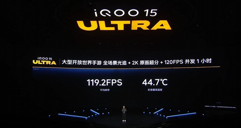 【ZOL中关村在线原创新闻】iQOO 15 Ultra内置自研Q3芯片,能为游戏实现超分、超帧、全场景光追体验,目前已有大型开放世界手游支持全场景光追+2K原画超分+120FPS并发,游戏一小时平均帧率119.2帧,机身最高温度44.7摄氏度。