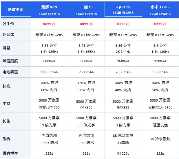综合来看,这四款4000元至5000元价位的游戏手机各有侧重。iQOO 15凭借KPL赛事认证与3200Hz瞬时触控成为电竞玩家的首选;荣耀WIN以10000mAh超大电池和185Hz超高刷屏在续航与流畅度上独树一帜;小米17 Pro的小屏设计与Leica影像系统满足了追求精致体验的用户需求;一加15则以165Hz超高帧率和7300mAh大电池成为游戏与续航的最优平衡之选。在选择时,建议根据自己的核心需求进行取舍:重度游戏玩家优先考虑iQOO 15或一加15,续航焦虑用户首选荣耀WIN,小屏爱好者则不容错过小米17 Pro。无论选择哪一款,这四款机型都能轻松应对当前市面上的3A级手游,让你在新的一年里畅享极致的游戏体验。