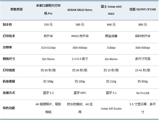 综合来看,四款便携照片打印机各有特色,适合不同的使用场景和人群。米家口袋照片打印机 Pro以539元的到手价提供了热升华打印品质和AR视频照片功能,是入门用户的最佳选择;KODAK Mini2 Retro以极致的轻便性和4PASS技术取胜,适合追求便携和复古情怀的用户;富士instax mini link3延续了经典的拍立得质感,15秒超快出片速度让分享更加即时;佳能SELPHY CP1500则以丰富的尺寸选择和专业级品质,满足了家庭用户和发烧友的需求。