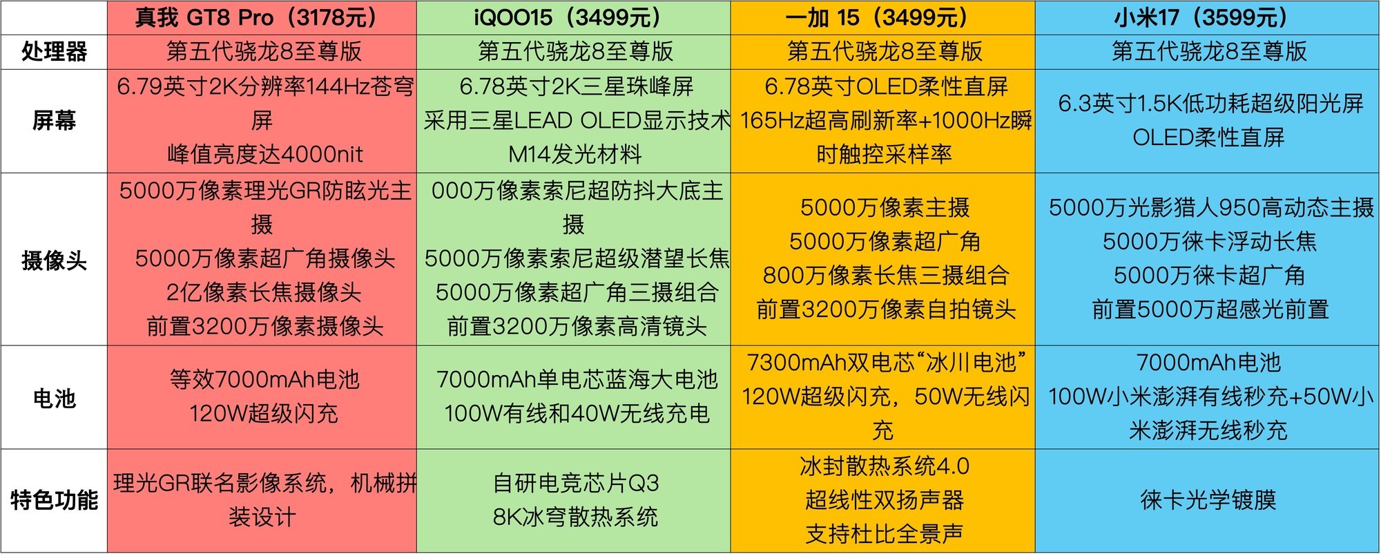 综上所述,四款机型均搭载第五代骁龙8至尊版处理器,性能表现均达到旗舰水准,核心差异集中在特色功能上。真我GT8 Pro性价比突出,兼顾影像与个性化;iQOO 15主打电竞体验,游戏优化专业;一加15侧重直屏与长续航,适合直屏爱好者;小米17是小屏旗舰,兼顾手感与影像。用户可根据自身预算、使用需求,选择最适配自己的机型。