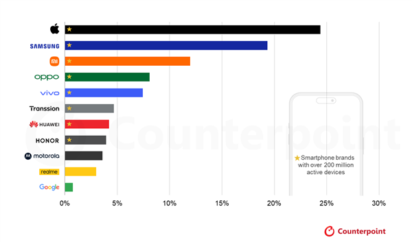 荣耀成为最新加入两亿台活跃装机量俱乐部的厂商;摩托罗拉与真我则已接近这一门槛,展现出较强的后续增长潜力。