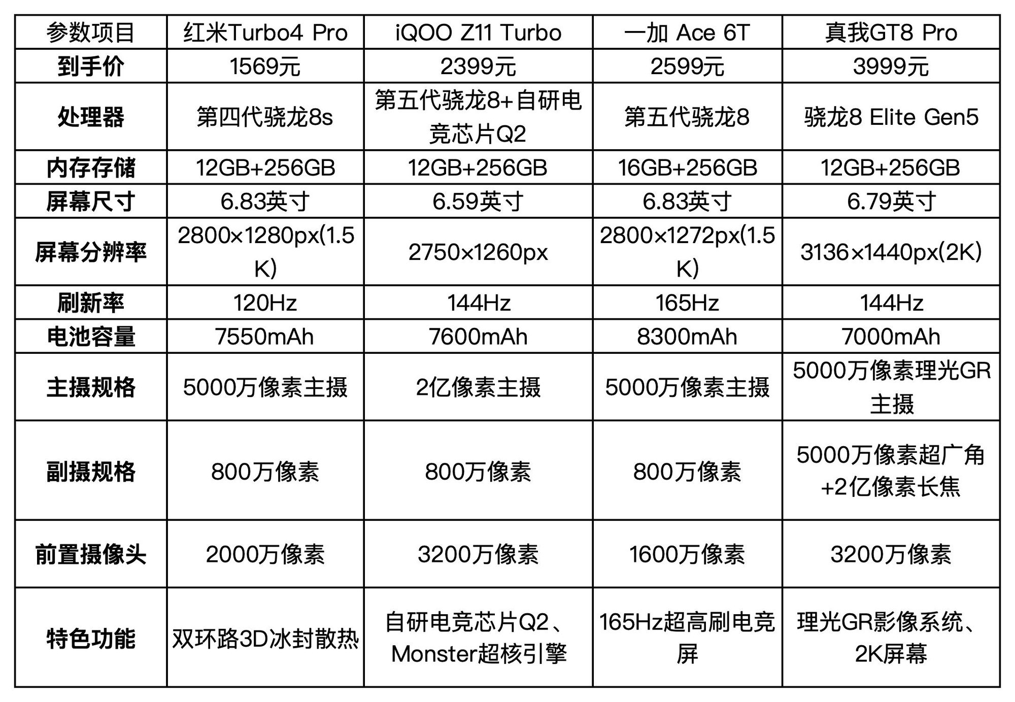 选购手机最重要的是明确自己的需求和预算。以上四款机型在各自价位段都具备很强的竞争力:1500元价位选择红米Turbo4 Pro获得最佳性价比;2500元价位选择iQOO Z11 Turbo平衡性能与拍照;2600元价位选择一加Ace 6T享受超大内存;4000元价位选择真我GT8 Pro体验旗舰品质。根据你的实际需求选手机,按需购买最踏实,毕竟适合自己的才是最好的。