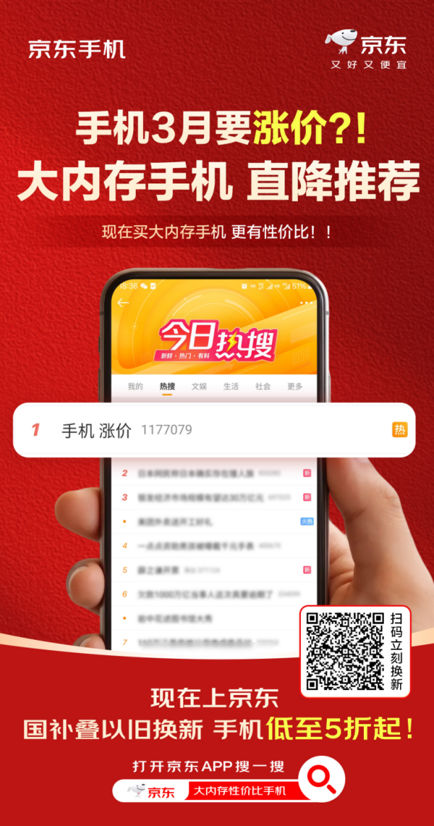 手机行业即将迎来全面涨价潮!近日,“手机涨价”相关话题冲上热搜,引发广大网友讨论。据ODM厂商等行业内部人士透露,2026年受智能手机存储芯片采购成本压力影响,多家头部手机品牌已拟定于今年3月初启动新一轮产品价格调整,这也将是近五年来手机行业规模最大、涨幅最为显著的一轮集体调价。如果你有换新手机的打算,不如趁涨价潮来临前,来京东抄底大内存旗舰手机,可享国补叠加以旧换新,低至5折起!有需要的消费者可到京东APP搜索“大内存性价比手机”进入活动页面下单,早买就是赚到。具体都有哪些大内存手机值得入手,让我们来看看。