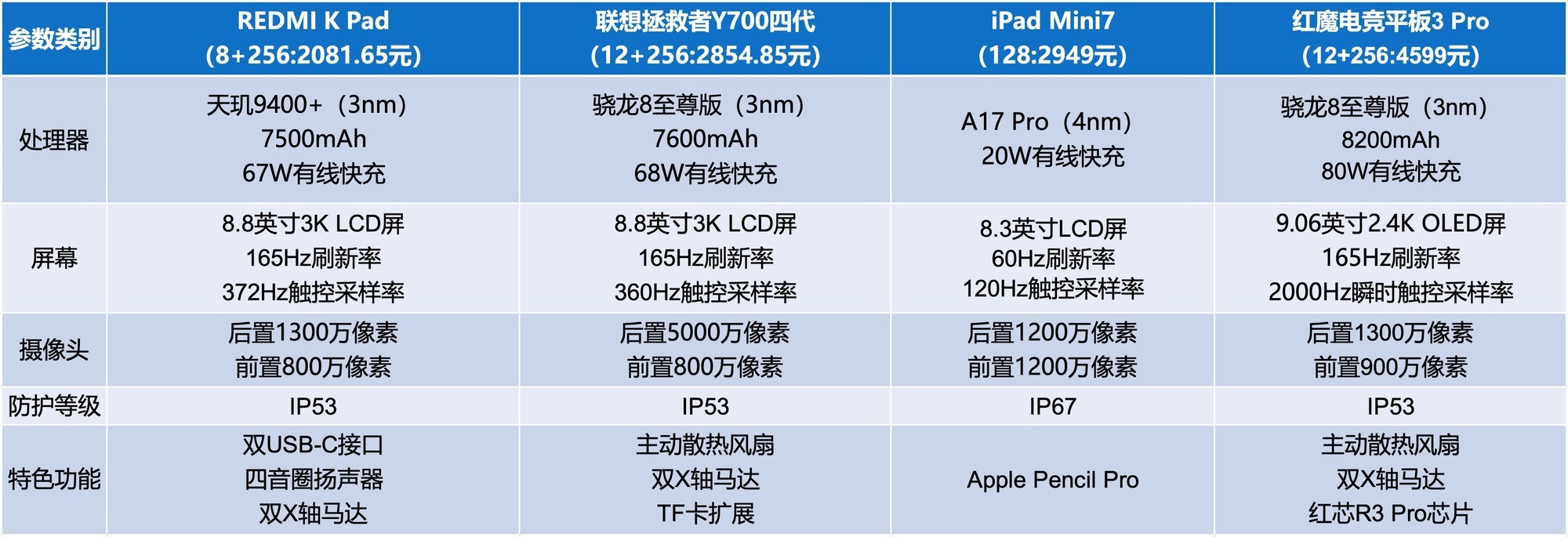 建议根据核心诉求选择:性价比选REDMI K Pad,电竞性能选联想拯救者Y700四代,生态体验选iPad Mini7,极致体验选红魔电竞平板3 Pro。