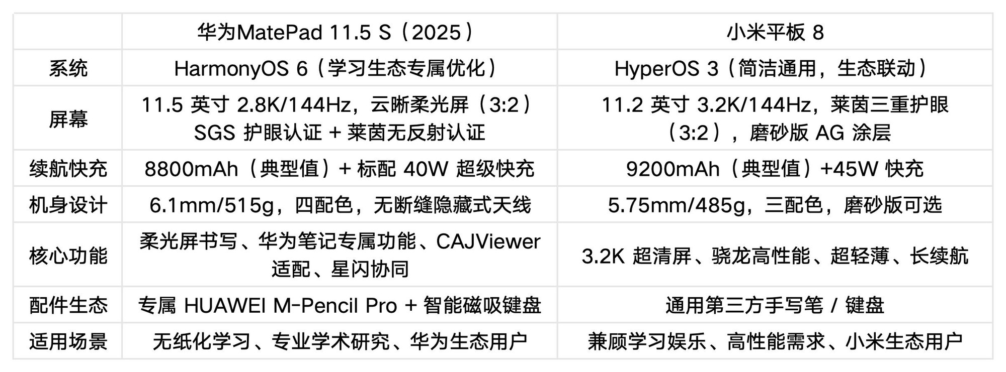 总体来说,华为MatePad 11.5 S偏学习生产力与生态体验,小米平板8偏全能性能与性价比;对照自己的使用重心选,最不容易后悔。