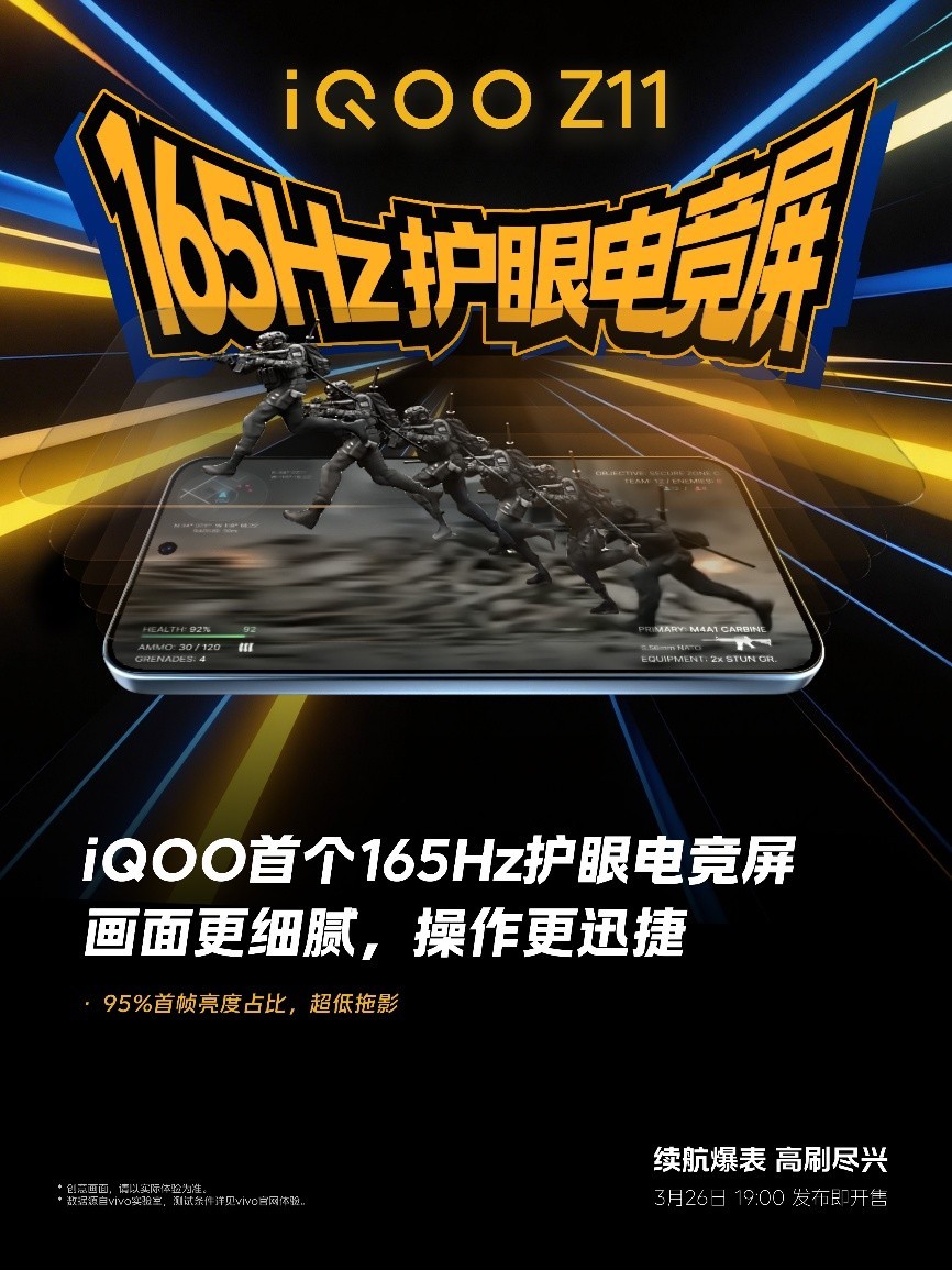 2026 年 3 月 23 日,iQOO Z11 越级首发iQOO 首个 165Hz 护眼电竞屏,将带来更为流畅细腻的画面显示、超低拖影表现以及更为灵敏的触控响应,为用户带来更加出色的操控体验。iQOO Z11 系列新机将于 3 月 26日 19:00 正式发布并开售,现已开启预约。
