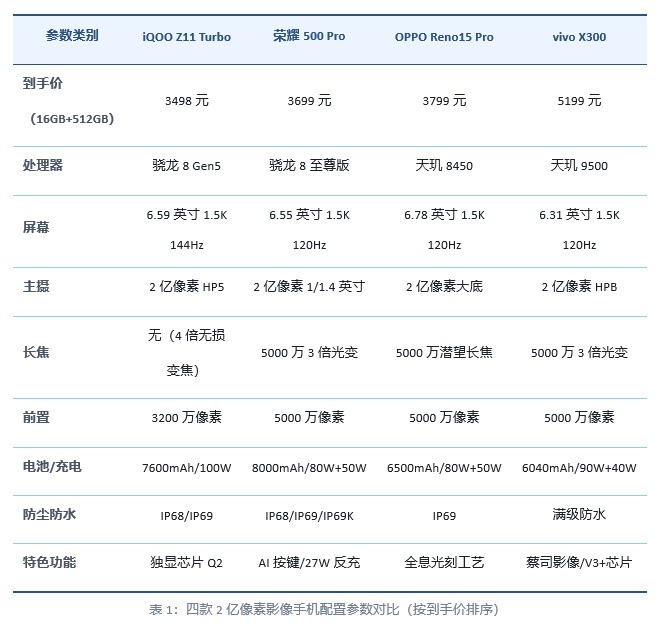 在3000至5000元价位段,上述四款2亿像素影像手机各有特色,消费者可以根据自身需求和预算做出选择。iQOO Z11 Turbo以3199元的到手价提供了骁龙8 Gen5加独显芯片Q2加7600mAh电池的组合,是预算有限但追求高性能用户的首选;荣耀500 Pro以3699元的价格实现了骁龙8至尊版加8000mAh电池加全焦段影像的全面均衡,适合追求“一步到位”的实用主义者;OPPO Reno15 Pro以3799元的价格带来了出色的工业设计和人像拍摄能力,是时尚用户的不二之选;vivo X300以4799元的价格在小巧机身内实现了旗舰级性能与影像能力,是小屏爱好者的终极选择。