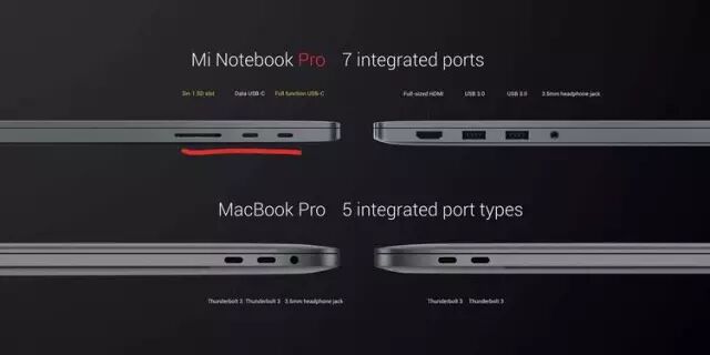 还有一点,小米笔记本 Pro 和苹果 MacBook Pro 对比接口,有多少人知道前者的 USB-C 和后者的压根就不是同一个东西,只是接口长得一样而已。