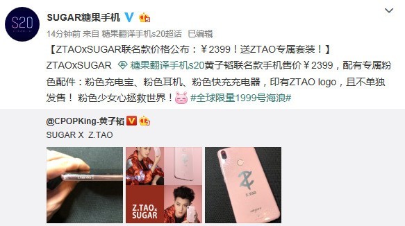 近日,糖果手机代言人黄子韬,在自己微博发文带来了自己首个联名款科技潮品--"Z.TAO X SUGAR"糖果翻译手机S20,随后糖果手机也公布了该款联名手机全球限量发售1999台,定价2399元。消息一经发布便掀起了众多粉丝关注和讨论。