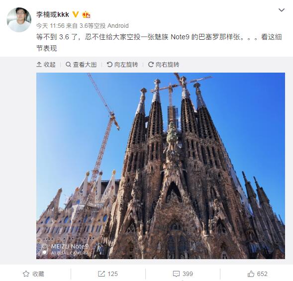中关村在线消息:这周是MWC 2019举办的日子,各家手机厂商都试图在这个期间炫技,吸引大家的目光。此前,有消息显示魅族即将发布新一代Note系列手机魅族Note 9,今天中午,魅族高级副总裁李楠在微博公布了一张由魅族Note9拍摄的巴塞罗那圣家族大教堂样张,并表示魅族Note9拍出的照片细节表现十分惊人。