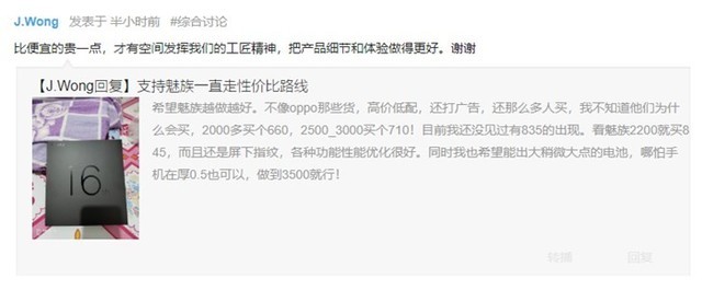 针对有用户表示希望魅族继续坚持性价比路线,黄章近日在社区表示,“比便宜的贵一点才有空间发挥我们的工匠精神,把产品细节和体验做得更好。”
