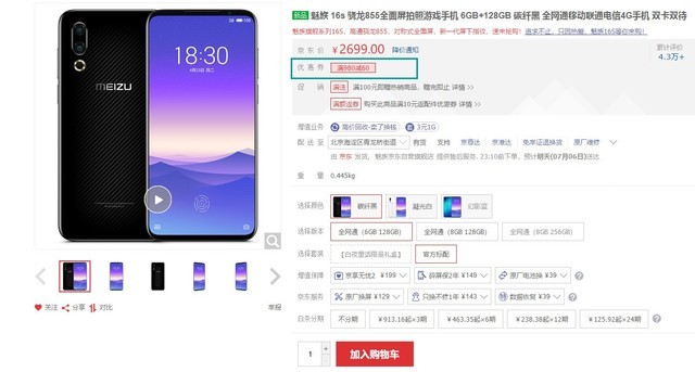 中关村在线消息:618年中大促期间魅族 16s曾直降499元,低至2699元,目前,该机型再次迎来购机福利,在京东魅族官方旗舰店购买,满980元即可立减60元,喜欢的朋友不妨关注一下吧!