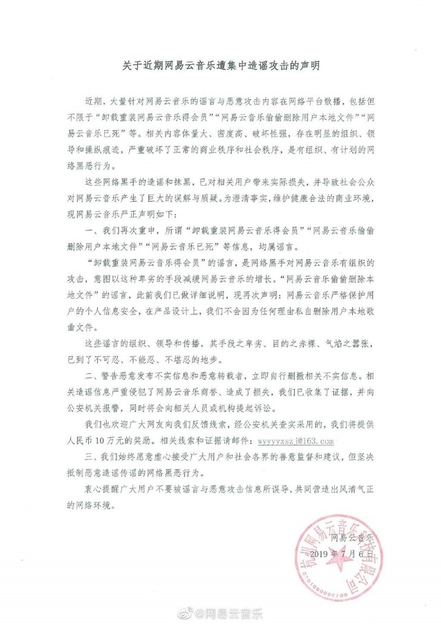 7月6日晚间消息,网易云音乐发布《关于近期网易云音乐遭集中造谣攻击的声明》。