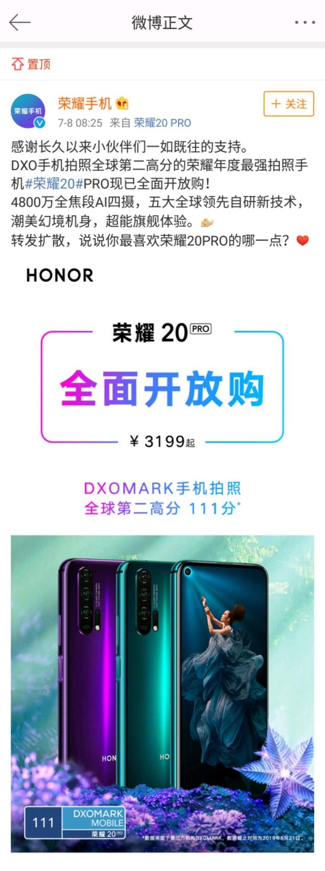 中关村在线消息:7月8日,荣耀手机微博平台正式宣布荣耀20 PRO全面开放购买。这款DXO手机拍照全球第二高分的手机在拍摄上有着上乘的体验:4800万全焦段AI四摄,全球领先自研技术。另外,荣耀官方还感谢小伙伴长久以来的支持。
