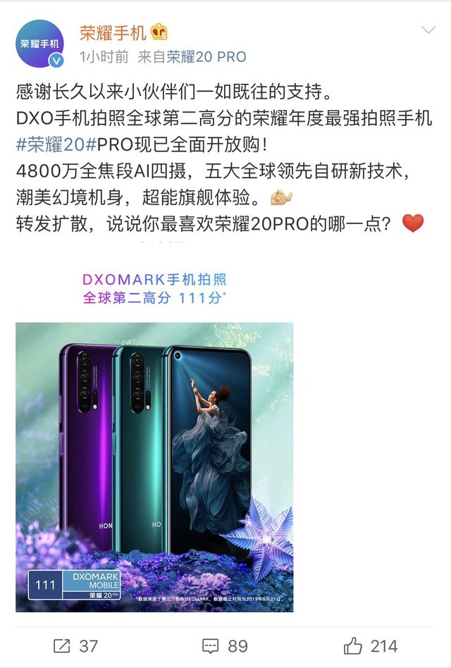 中关村在线消息:今晨,@荣耀手机官方微博发布消息,荣耀20 PRO已全面开放购买。值得一提的是,该机曾在DxOMark获得111的高评分,是目前DxOMark的第二高分。