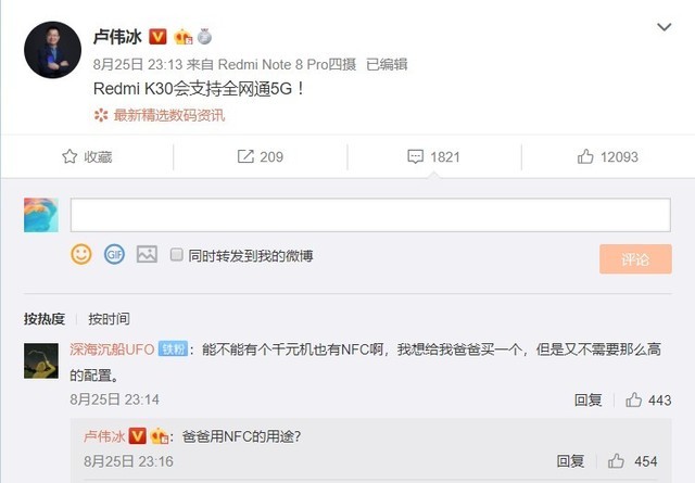 小米 CEO 雷军直接在评论区回复:必须的。