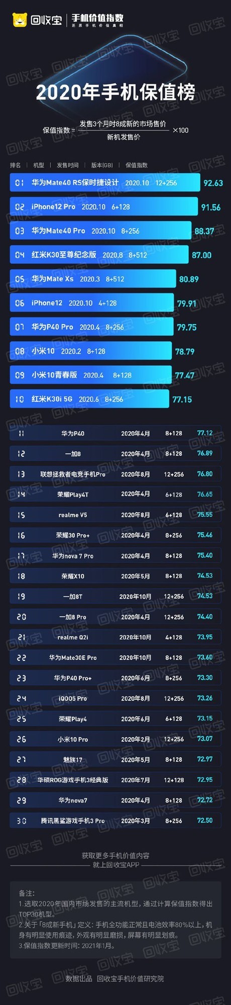 榜单显示,华为Mate40 RS保时捷设计保值指数高达92.63,傲居榜首。iPhone 12 Pro以91.56的保值指数排名第二,华为Mate40 Pro位列第三,保值指数为88.37。此外,红米K30至尊纪念版、华为Mate Xs、iPhone 12、华为40 Pro、小米10、小米10青春版、红米K30i 5G跻身前十。