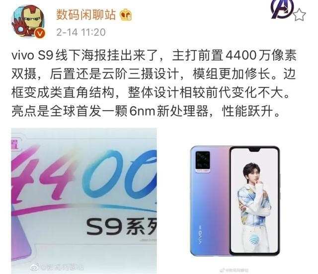据某博主爆料vivo S9的具体配置:将主打前置 4400 万像素双摄,机身采用了直角结构,首发一款 6nm 新处理器。