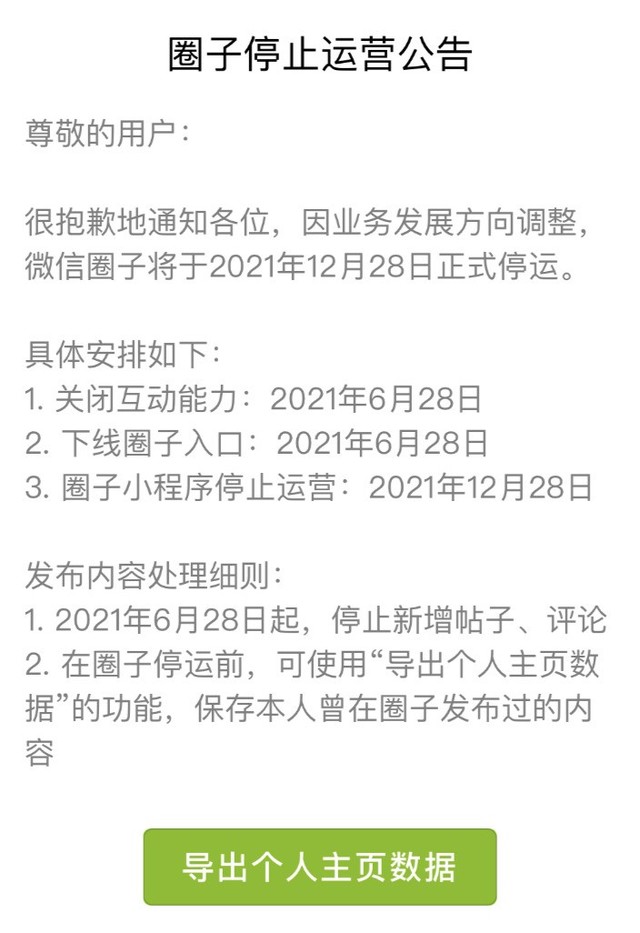 2021年5月28日,微信宣布“圈子”功能将于2021年12月28日正式停运。